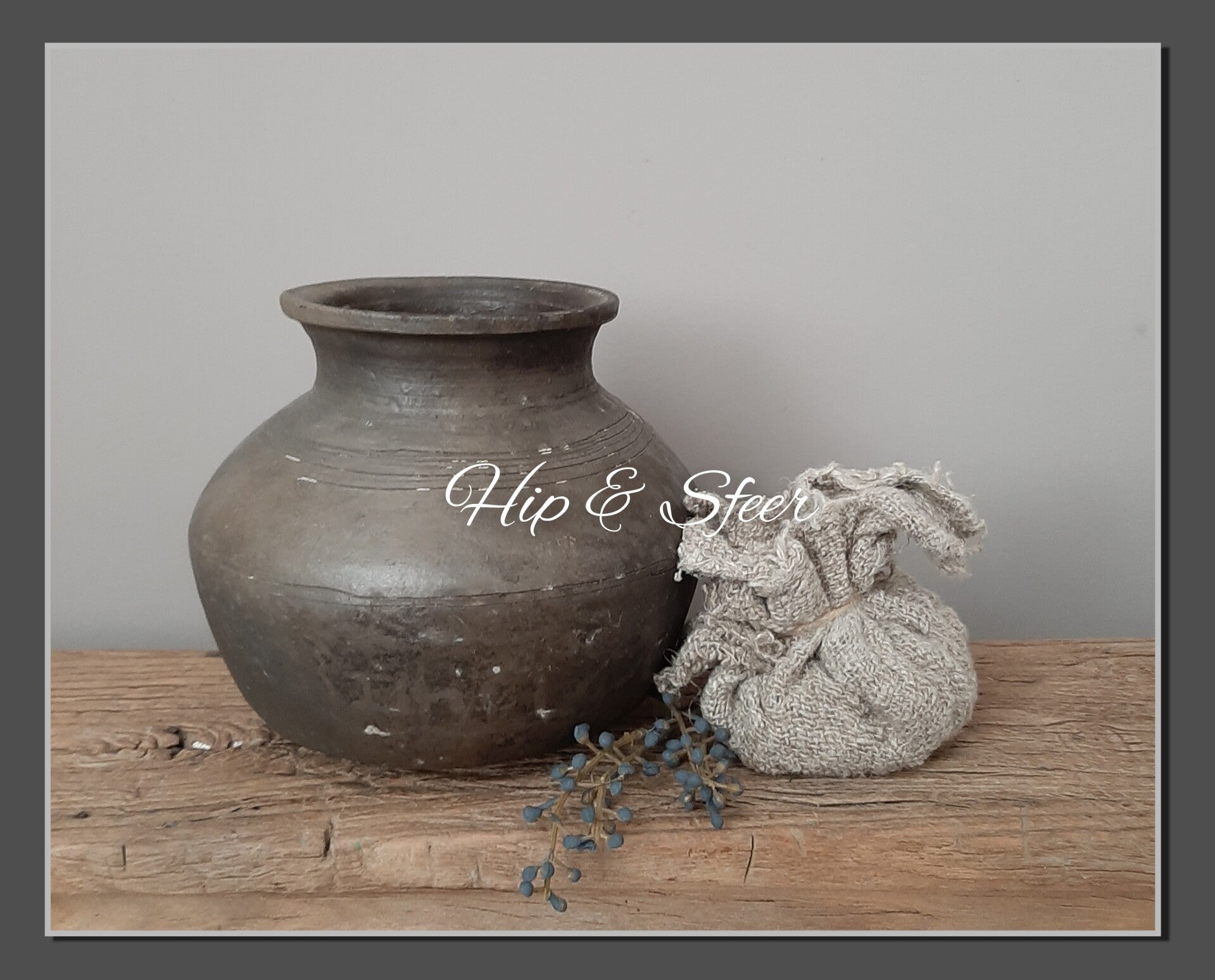 Mooie oude tuimel/oliepot in donkerbruine tint waarvan de onderkant niet helemaal vlak is en daardoor ook niet helemaal recht kan staan. De hoogte is 17cm en de doorsnee is 18cm. De opening is 9cm.