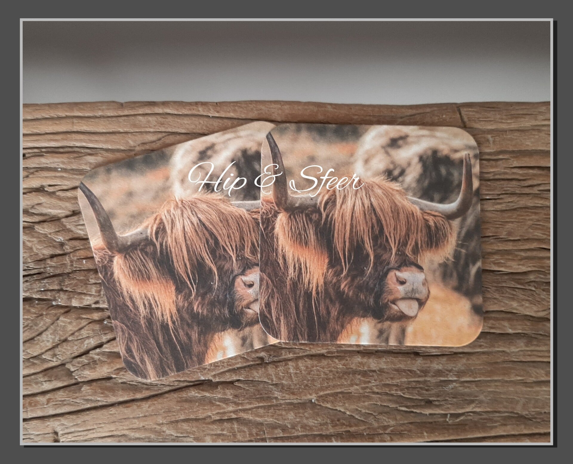 Onderzetters van stevig karton met de afbeelding van een hooglander kop. Aan 2 kanten bedrukt. De afmeting is 9,5x9,5cm.