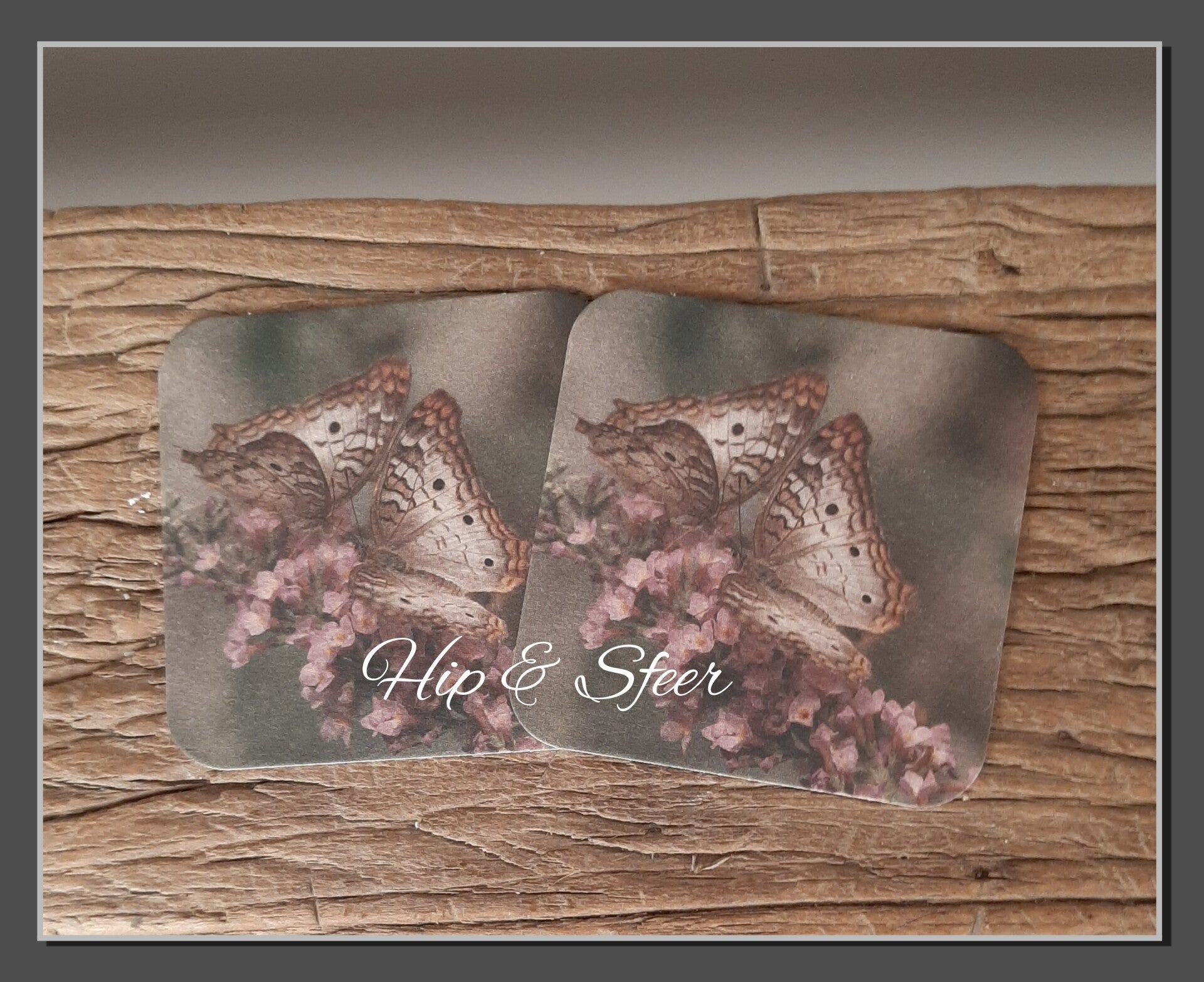Onderzetters van stevig karton met de afbeelding van 2 vlinders. Aan 2 kanten bedrukt. De afmeting is 9,5x9,5cm.