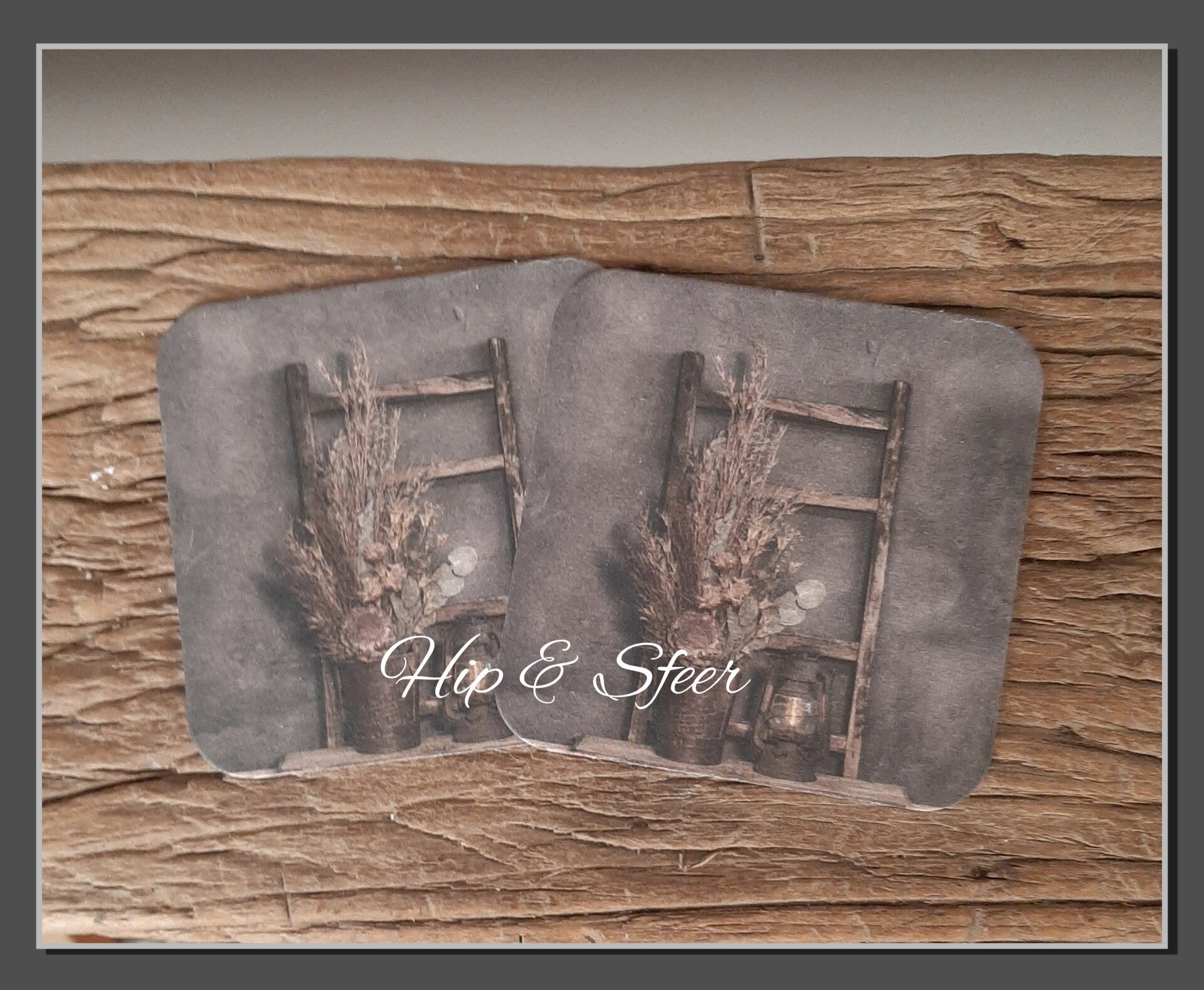 Onderzetters van stevig karton met de afbeelding van een pot met gedroogdebloemenbij een houten ladder. Aan 2 kanten bedrukt. De afmeting is 9,5x9,5cm.