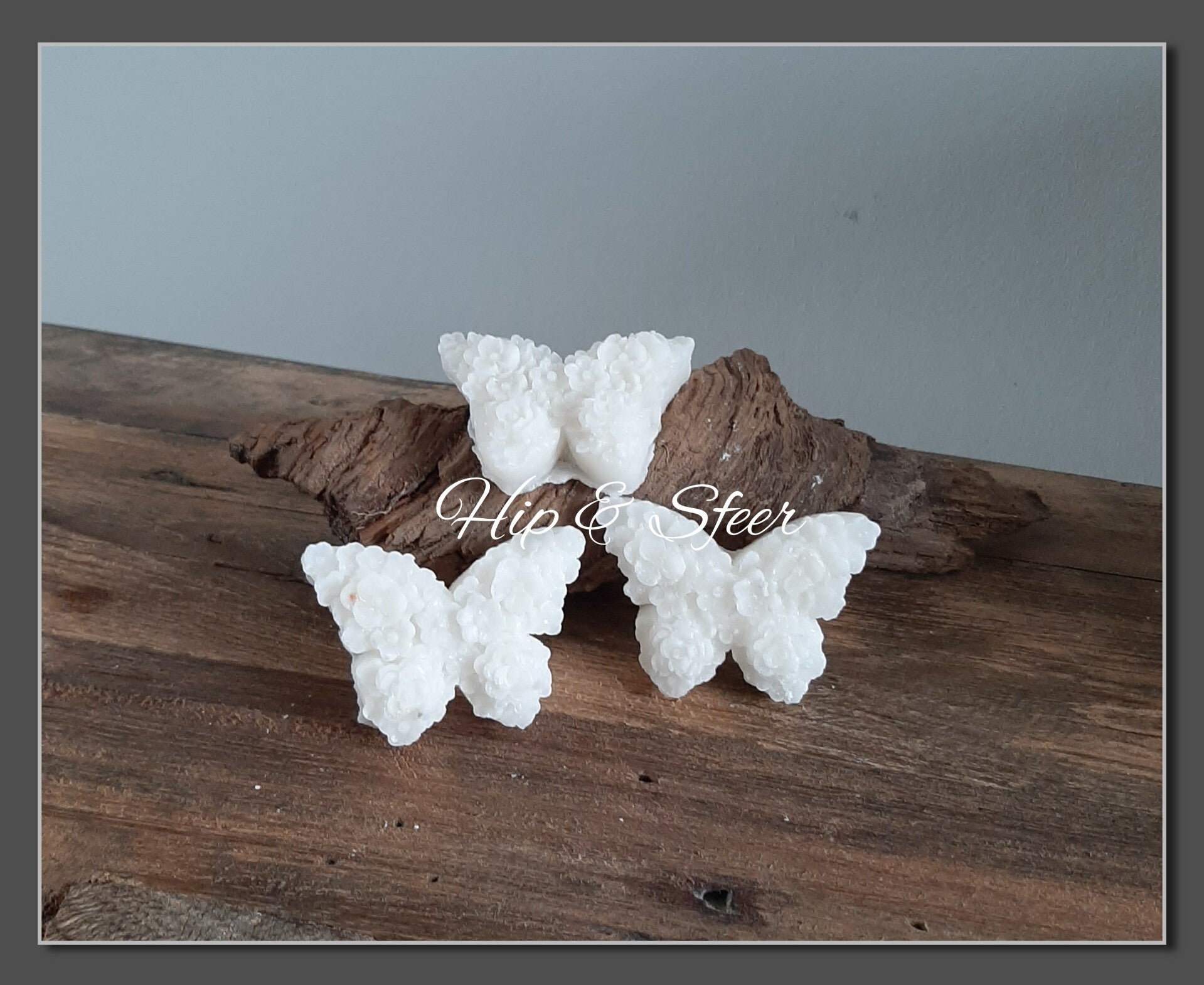 Heerlijk geurende amber vlinders. De vlinders zijn afgewerkt met kleine bloemetjes. De afmeting is 3,5cm hoog, 5cm breed en 1cm dik.