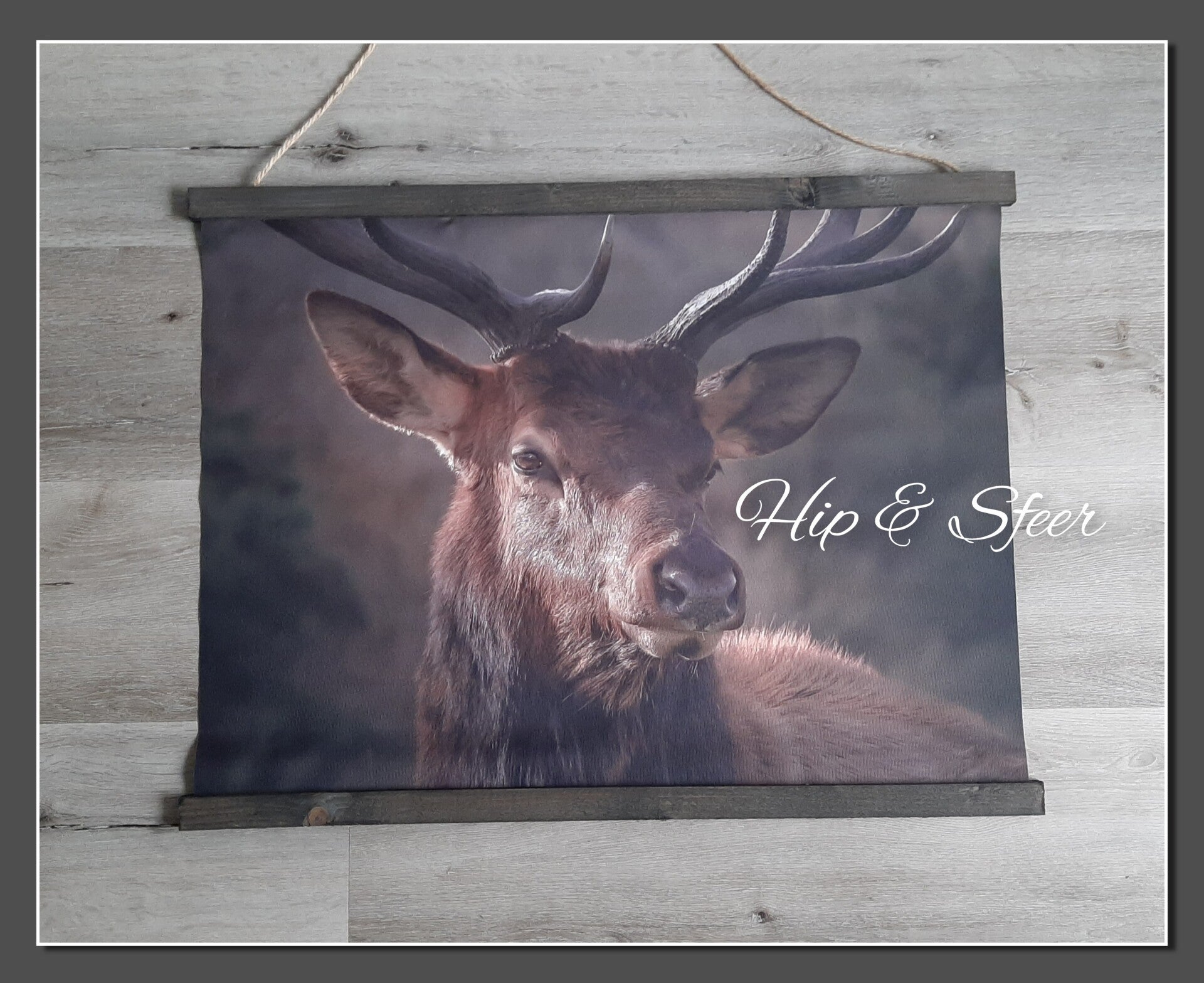 Prachtige wanddoek met de afbeelding van een edelhert in mooie heldere kleuren. Dit wanddoek heeft een afmeting van 80cm breed en 60cm hoog. Is voorzien van zwarte latten aan de onder-en bovenkant en heeft een ophang koord.