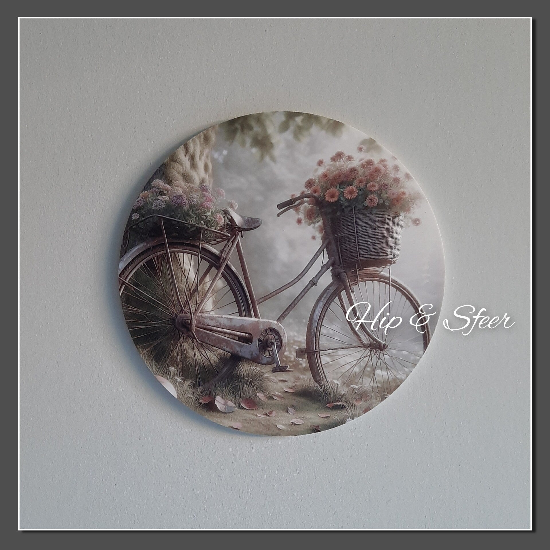 Prachtige muurcirkel met de afbeelding van een fiets met manden met bloemen. Deze muurcirkel heeft een doorsnee van 30cm. Het materiaal is 5mm forex, dat is stevig geschuimd pvc.