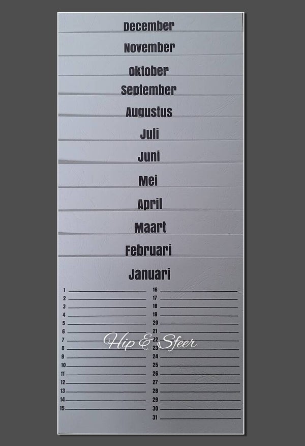 Leuke houten verjaardags kalender met elke maand apart op een los vel dik papier. Aan de houten kalender zitten 2 ophang systemen aan de achterzijde om hem op te kunnen hangen. De afmeting is 35cm hoog, 25,5cm breed en 3,5cm dik.