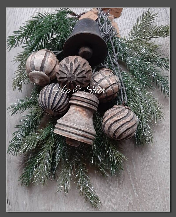 Leuke houten kerstbal met een motief in het hout. Deze is voorzien van koord om hem op te kunnen hangen of in een toef te verwerken. De doorsnee is 5cm.