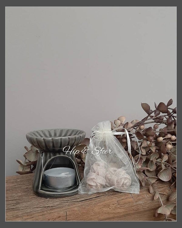 Keramiek amber brander met een bewerkt schaaltje waar de amberblokjes/figuren opgelegd kunnen worden. Deze heeft een stone kleur.
