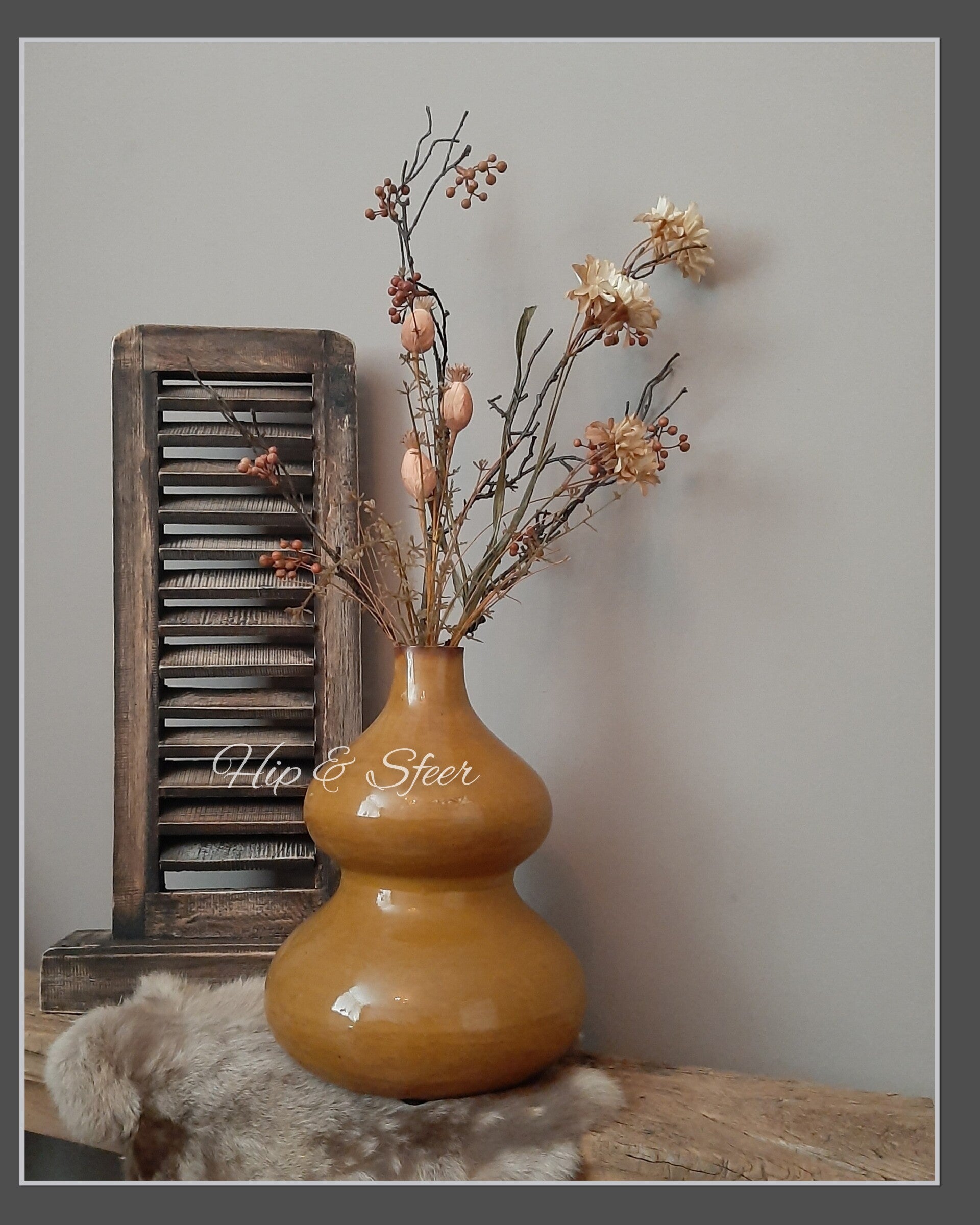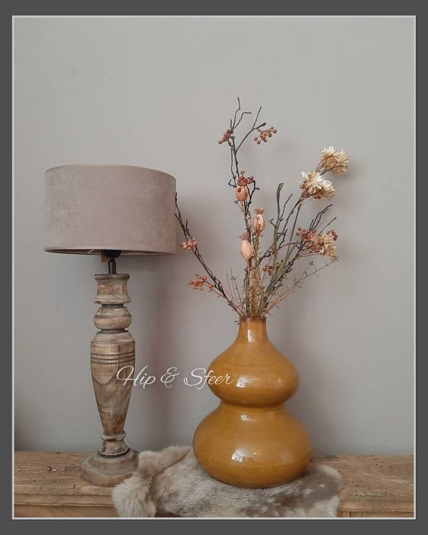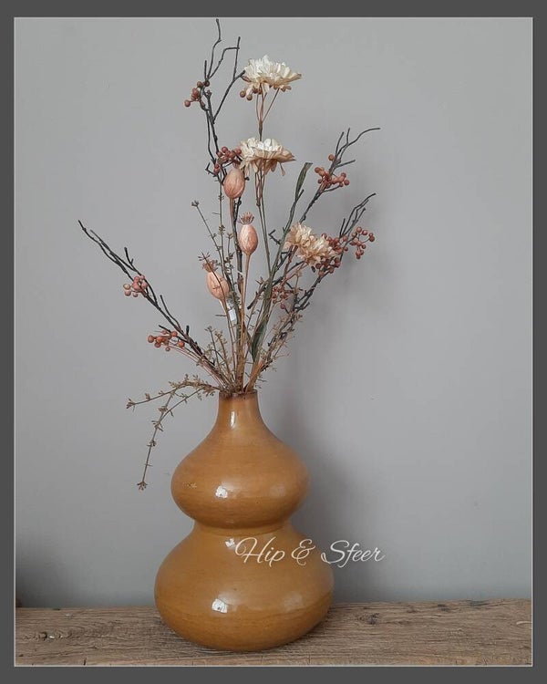 Prachtige metalen vaas in een mooie warme mosterd kleur. Deze vaas heeft een mooie ronde bolvorm. De afmeting is: 30,5cm hoog en de doorsnee is 24cm. De opening is 5,5 cm doorsnee.