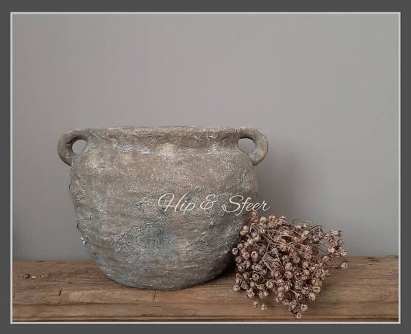Mooie stenen pot met oortjes in lichte zandkleur. Deze pot is niet egaal aan de buitenkant. Mooie zware kwaliteit. De afmeting is 30cm doorsnee en 22cm hoog. De opening aan de bovenkant is 19cm doorsnee