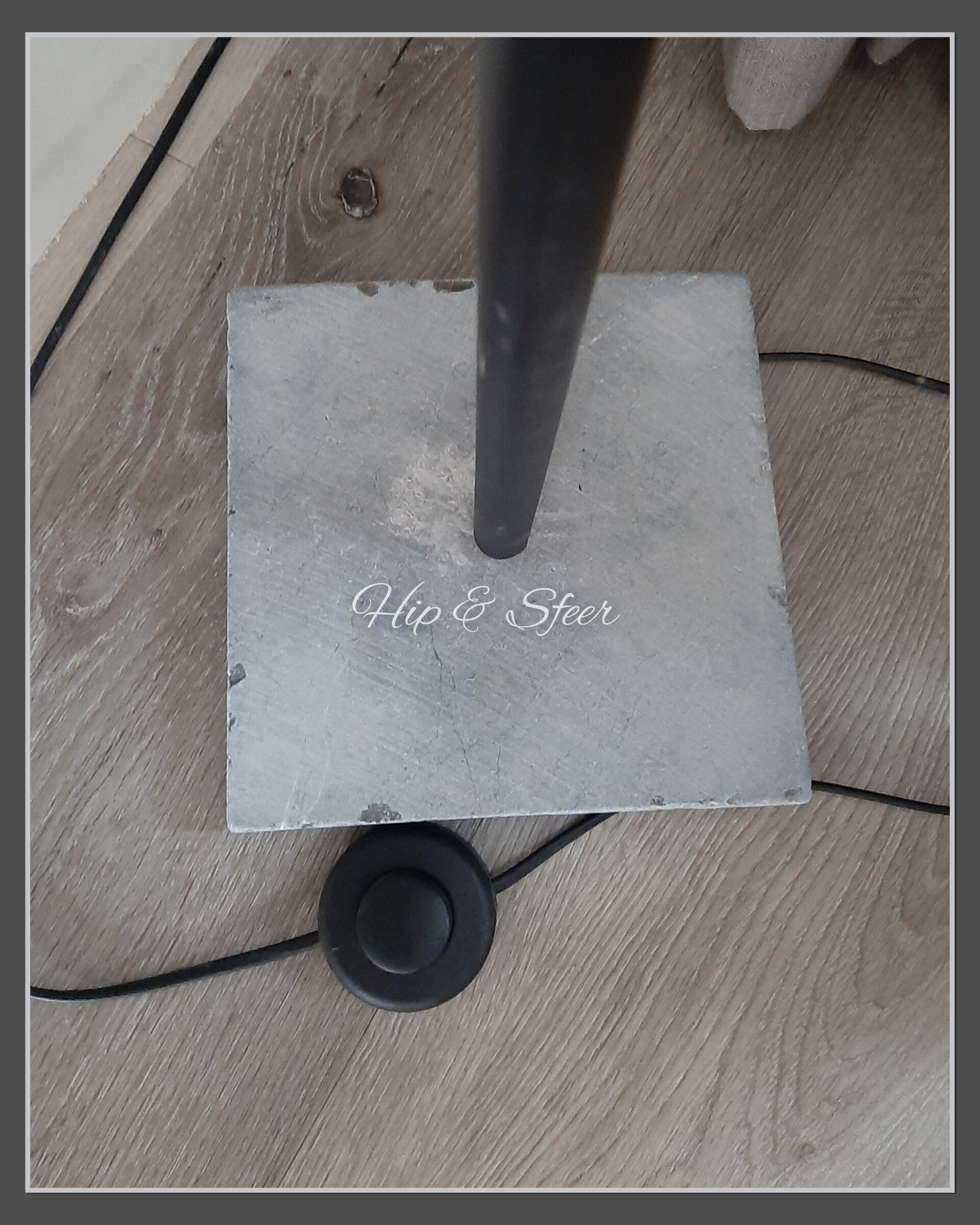 Mooie zwart metalen vloerlamp op een lichtgrijze chinees hardstenen voet. Met een grond schakelaar. De afmeting is 133cm (incl.fitting) hoog en de voet is 20x20xm. Exclusief kap. Deze is los verkrijgbaar.