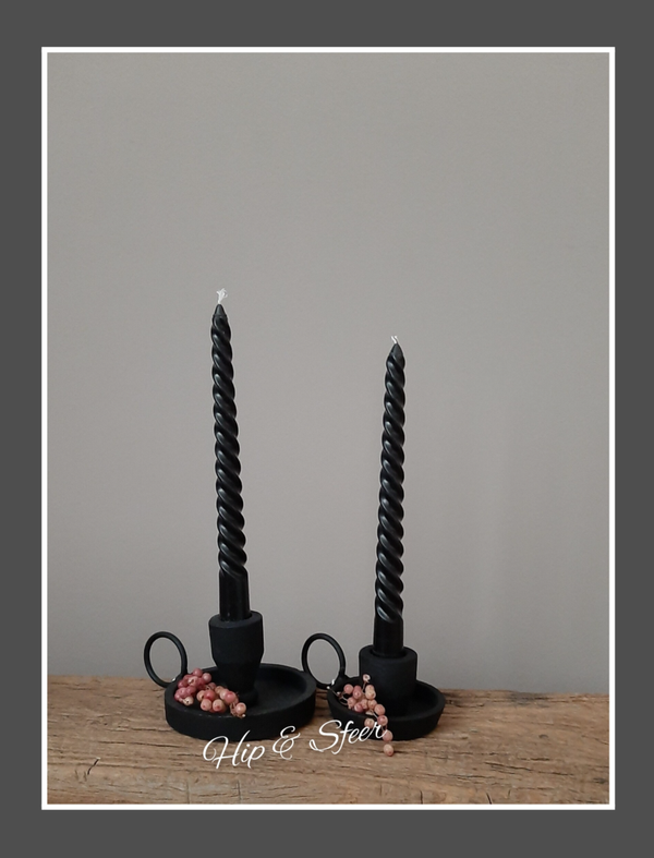 Prachtige mat zwarte gietijzeren kaarsenstandaard, geschikt voor een dinerkaarsje of spiraal kaars. De afmeting is 6x12cm. mooie zware kwaliteit. excl. kaars