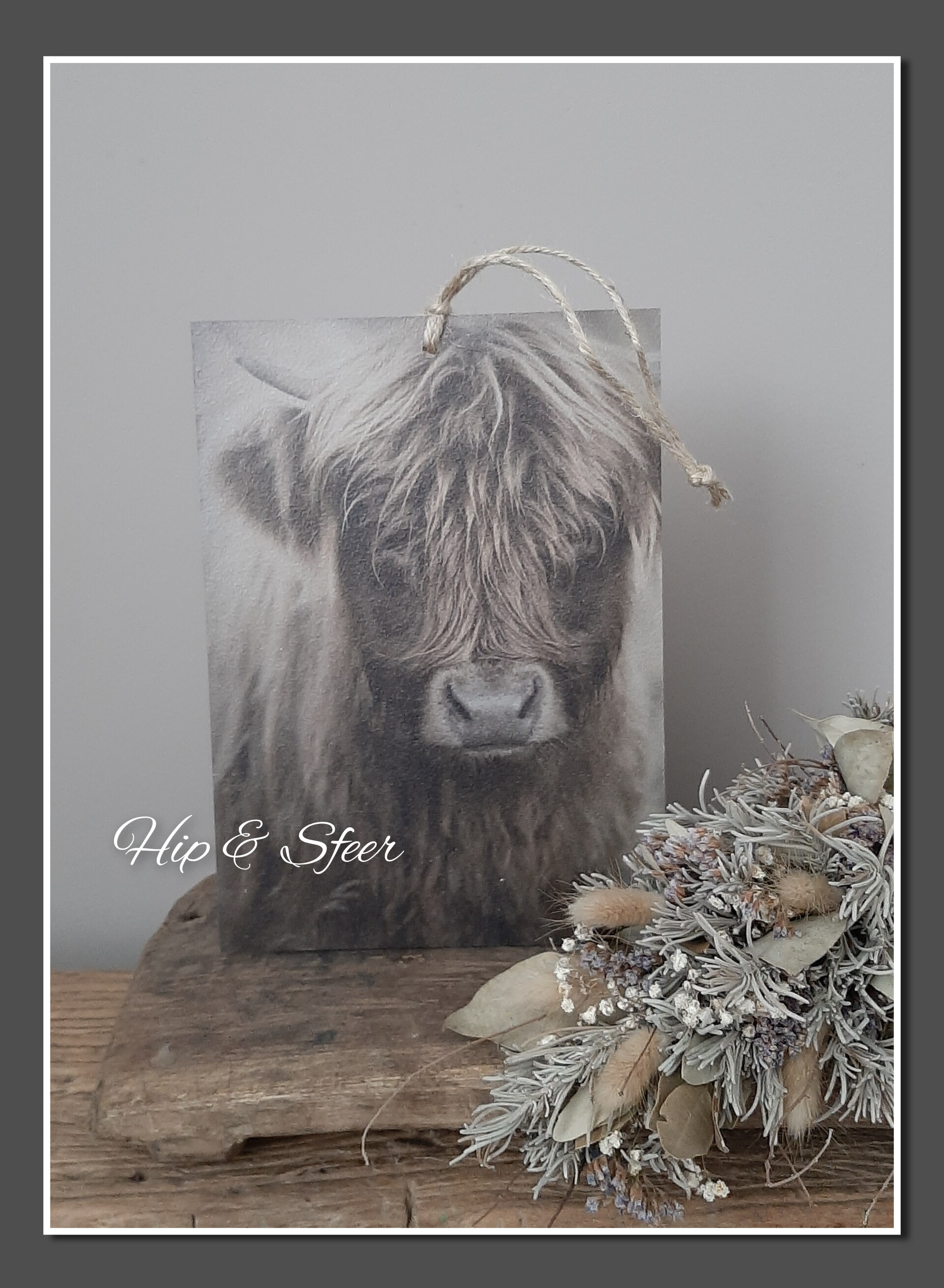 Mooi houten decobordje met de afbeelding van een hooglander jong in sobere matte tinten. De afmeting is 15x20cm incl. ophang koordje.