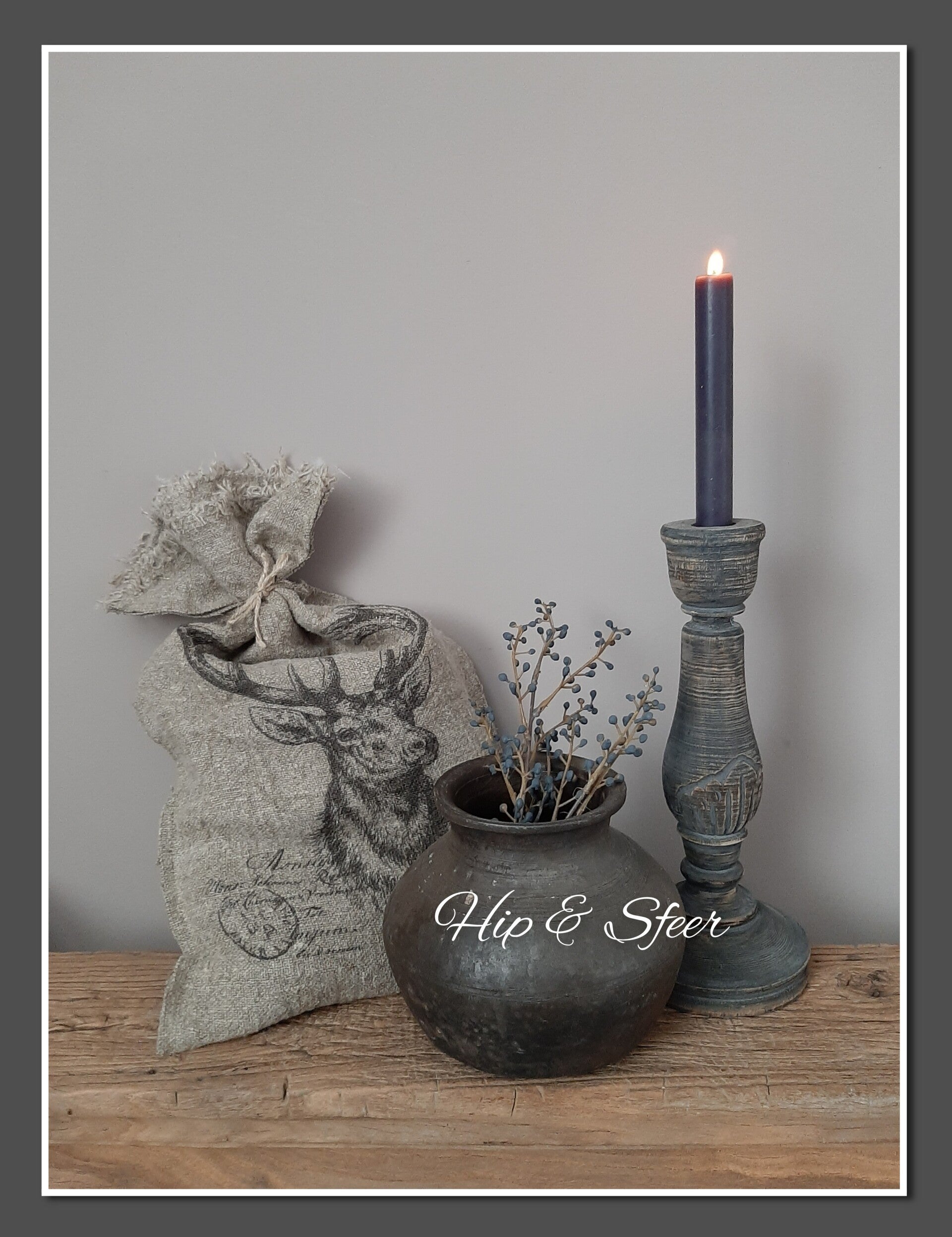 Leuke decoratie shabby zak met de afbeelding van een edelhert. Deze zak is gevuld met watten en er kunnen ook ledlampjes in gedaan worden voor extra sfeer (tijdens de donkere dagen). De afmeting is 30x48cm.