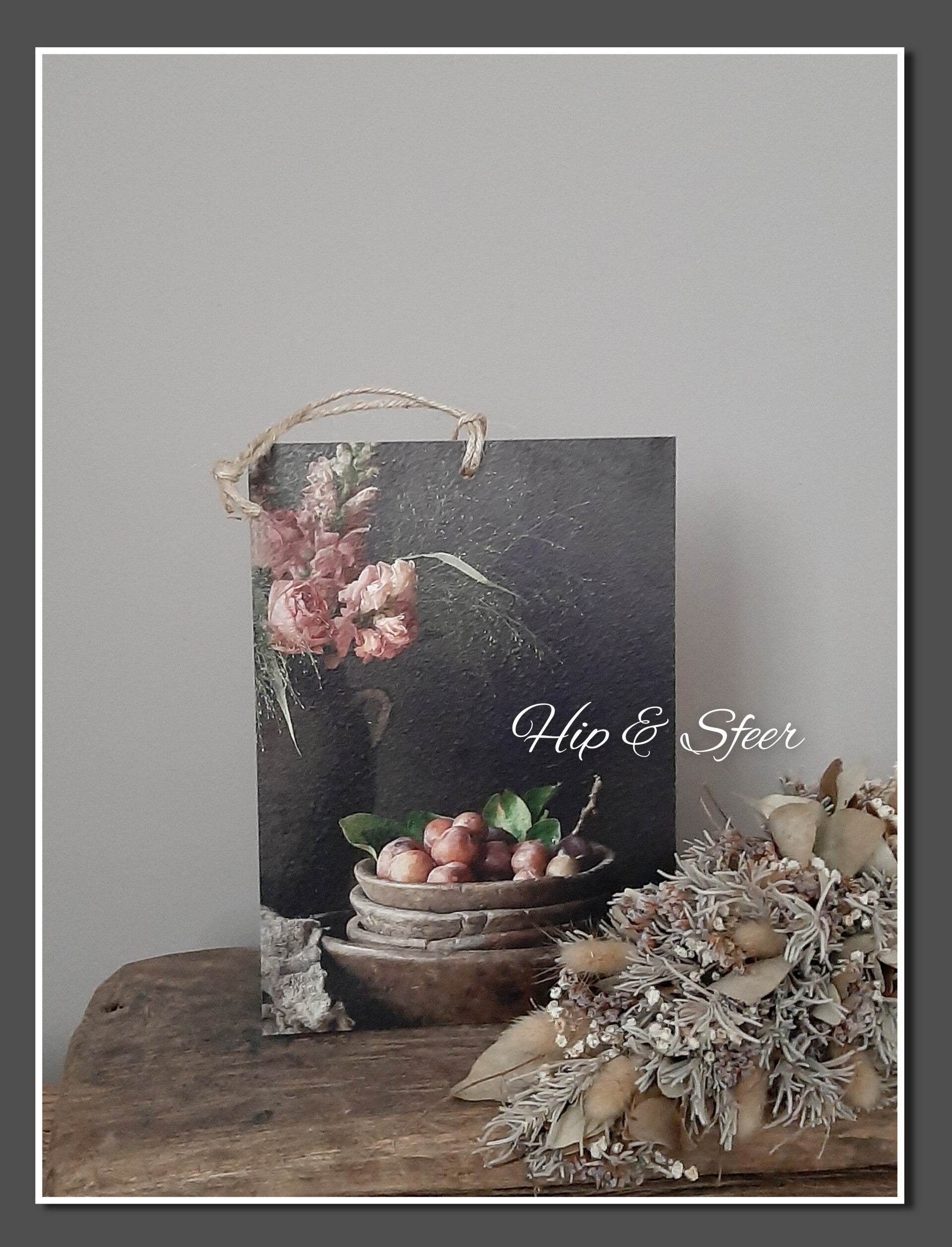 Prachtig houten decobordje met de afbeelding van oude schalen met pruimen in mooie matte tinten. Het bordje heeft een afmeting van 15x21cm en is voorzien van een ophang koordje.