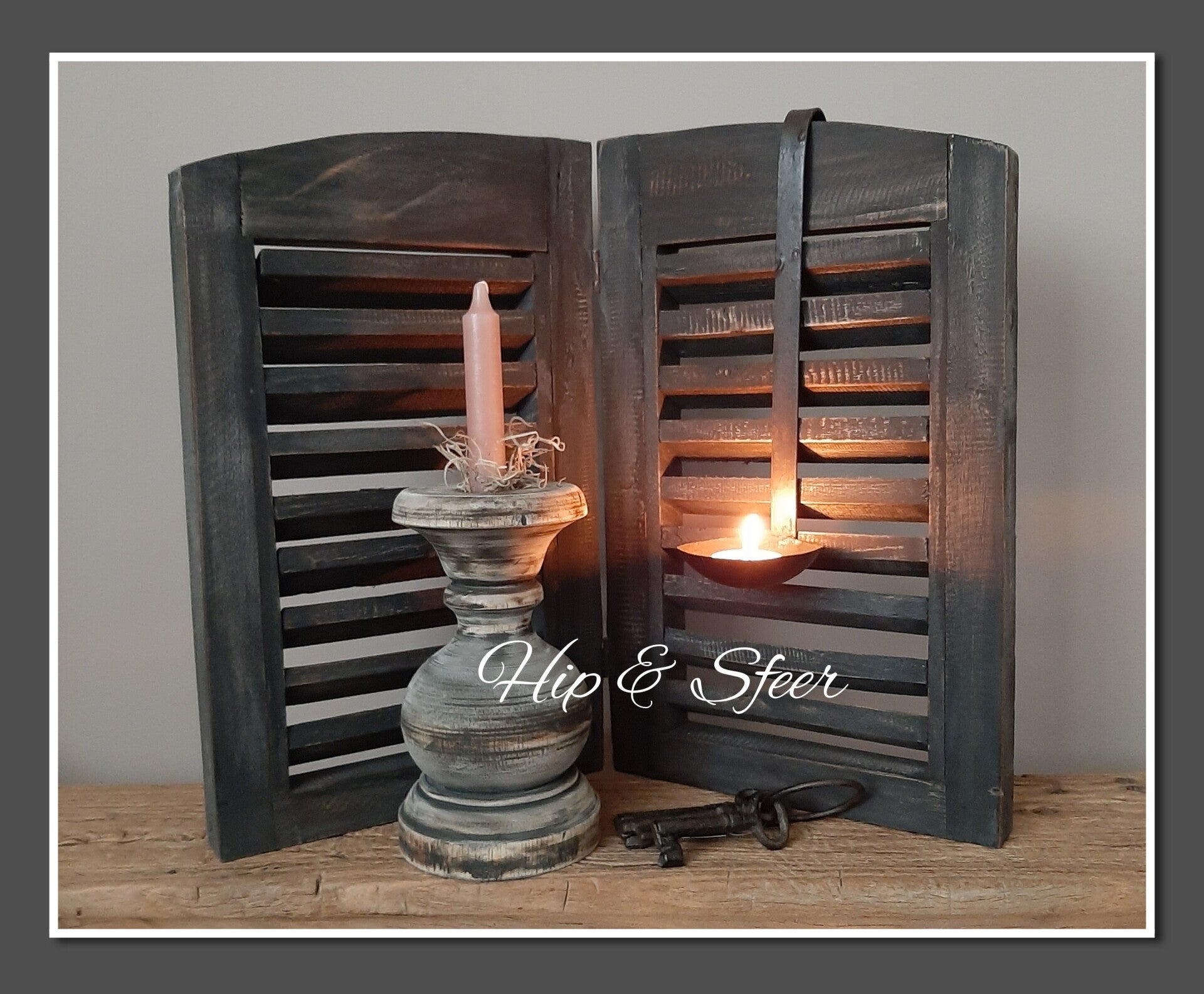 Prachtig houten geschakeld luikje in zwart tinten. Dit luik heeft een afmeting van 40cm hoog en 49cm breed. Leuk met een hanglepel eraan, een waxinehouder of mooie kaarsenstandaard erbij.