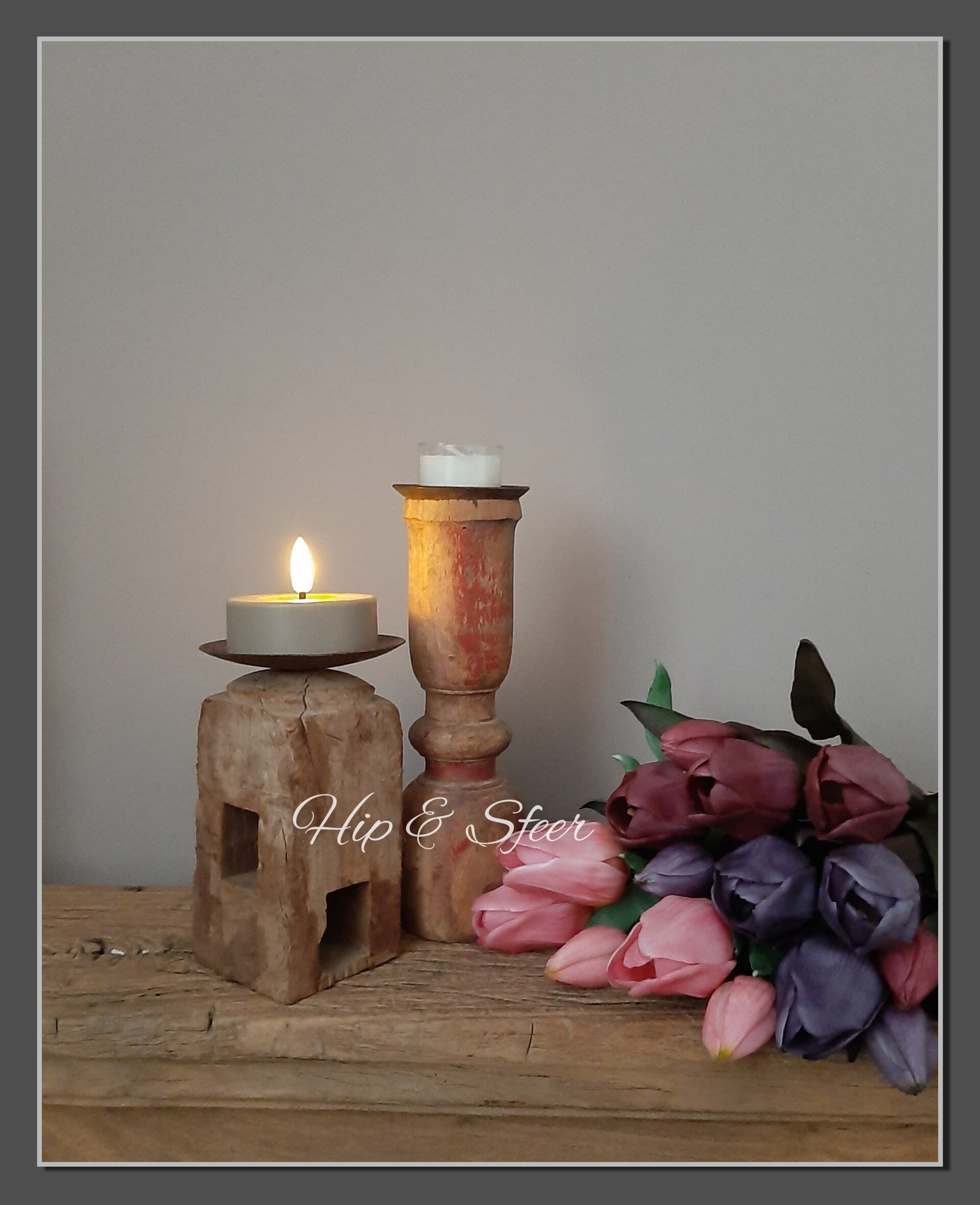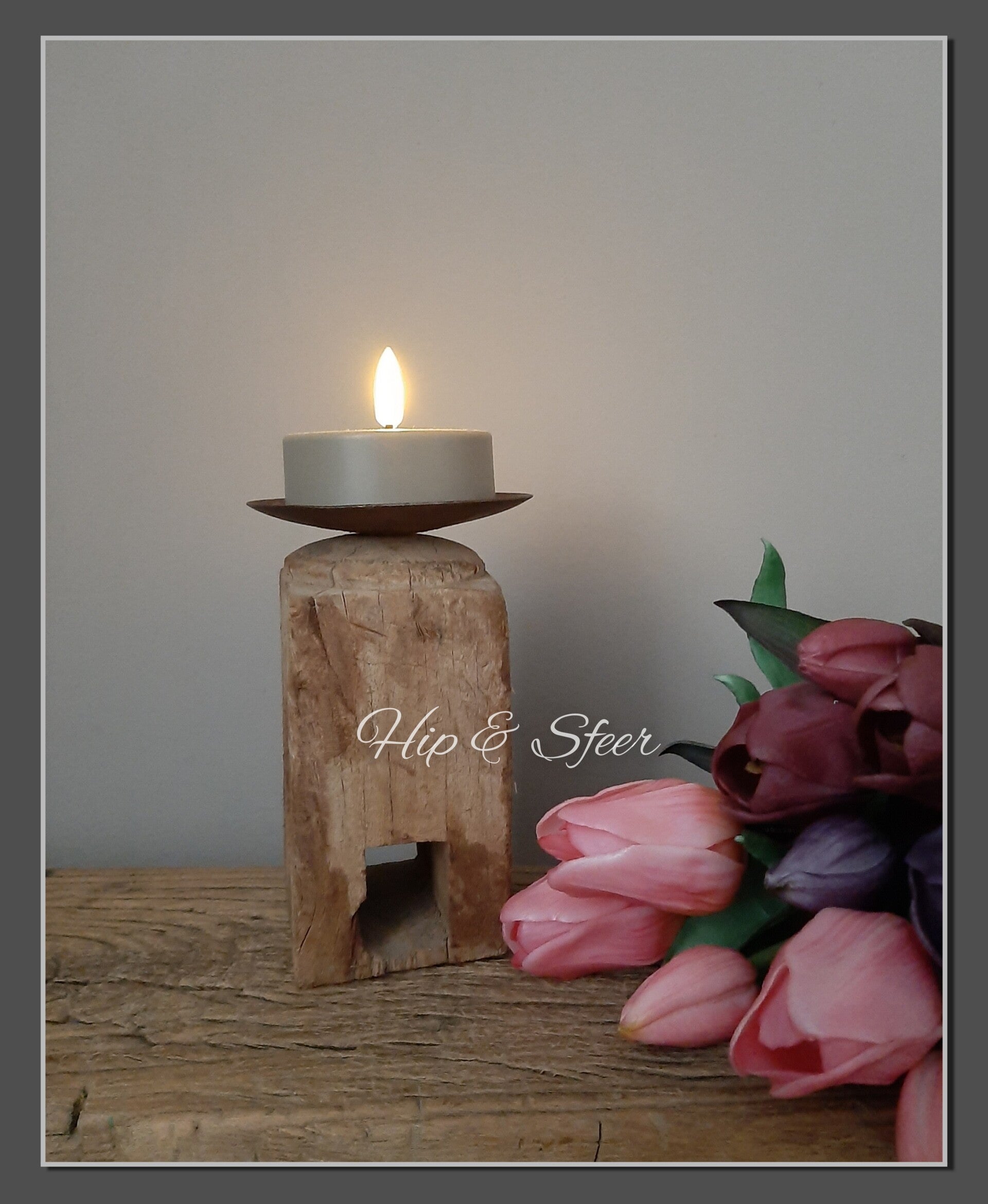 Mooie houten kaarsenstandaard waar een stompkaars op kan. De afmeting is 14cm hoog en de onderkant is 6-6,5x6-6,5cm.