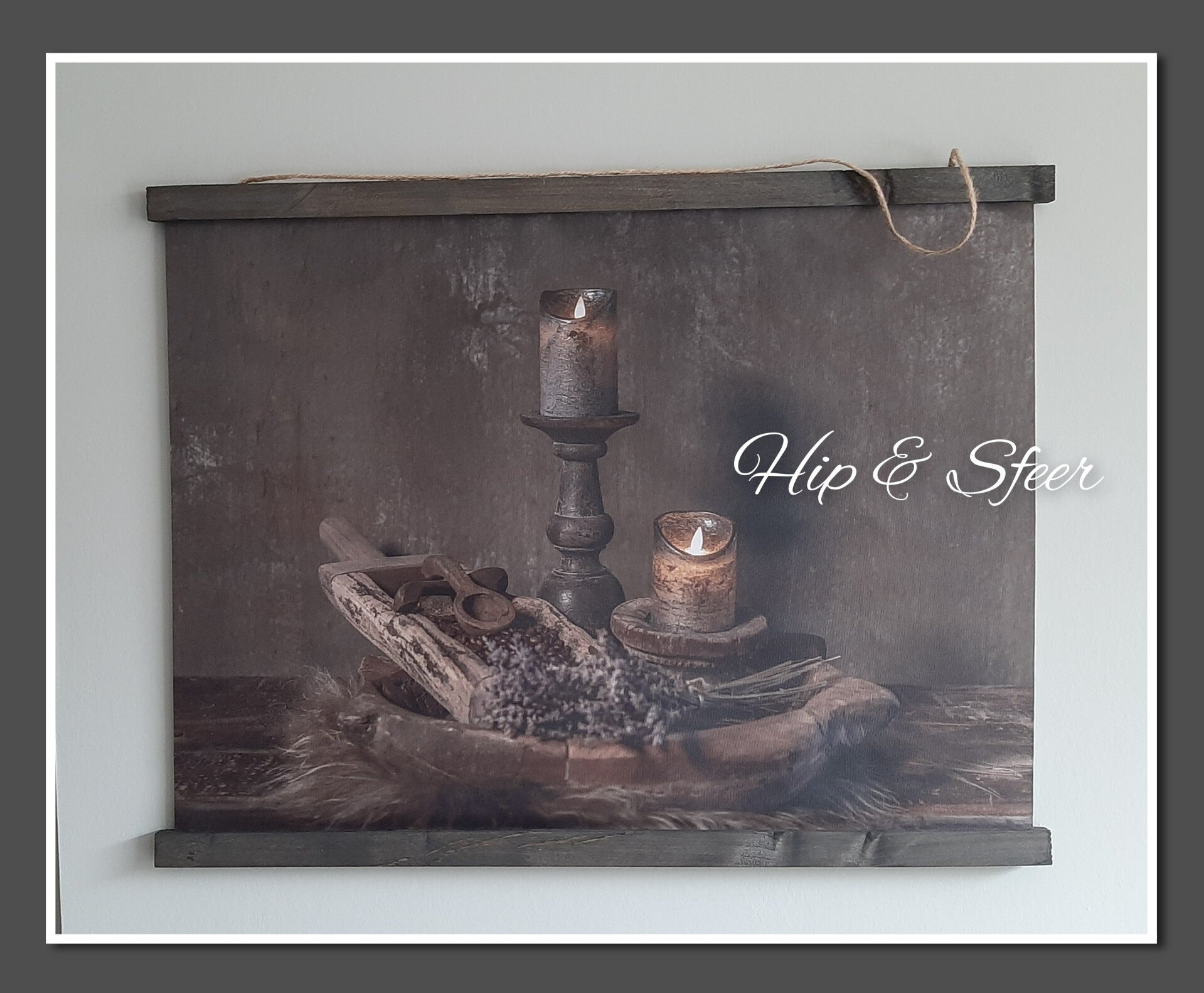 Prachtig wanddoek met de afbeelding van een houten schaal met dadeltak en kaarsenstandaards. Dit wanddoek heeft een afmeting van 80cm breed en 60cm hoog. Is voorzien van zwarte latten aan de onder-en bovenkant en heeft een ophang koord.