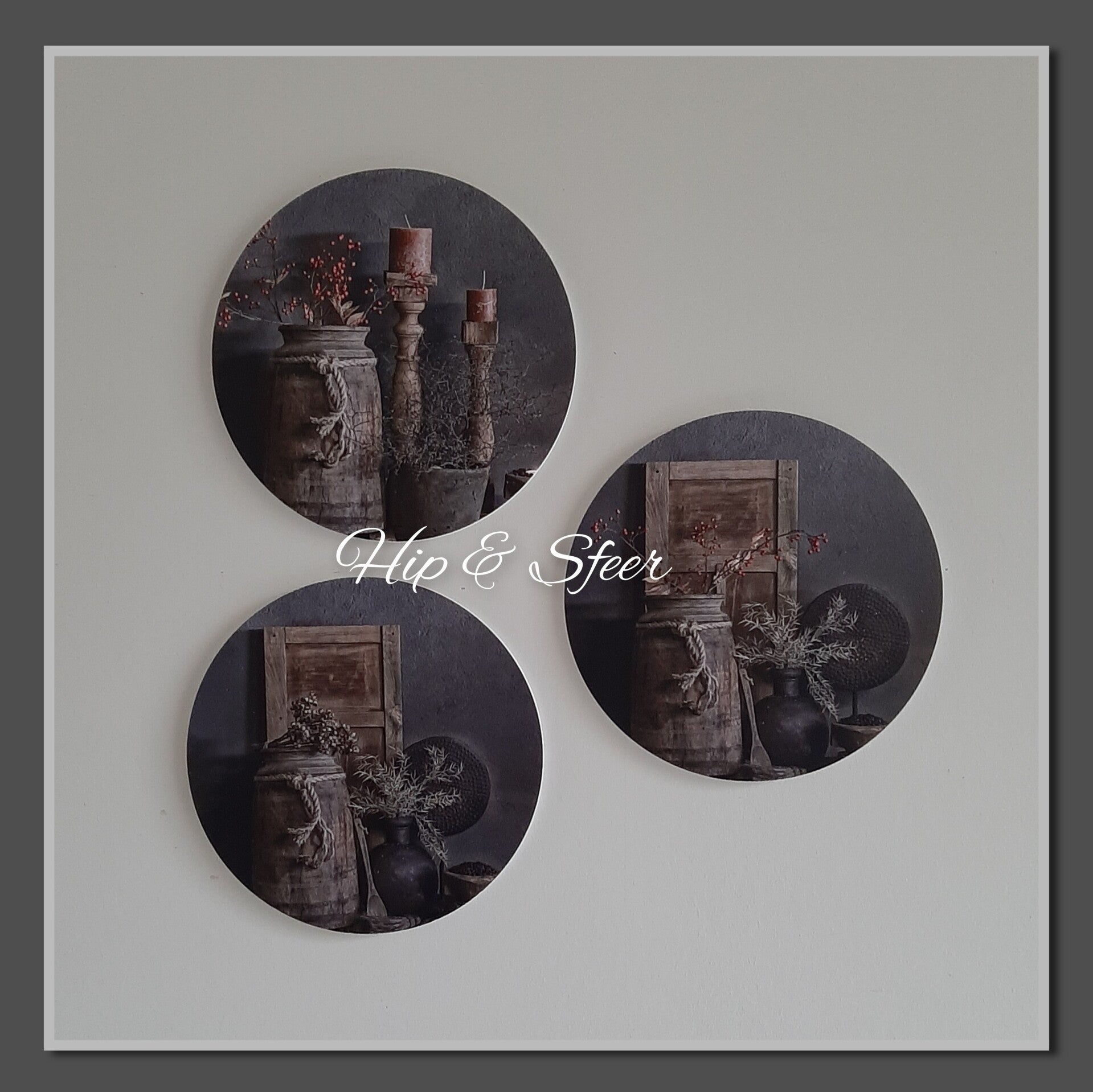 Mooie muurcirkel met de afbeelding van kandelaren en een Nepalese pot. Deze cirkel heeft een doorsnee van 18cm en het materiaal is 5mm forex dat is stevig geschuimd pvc.