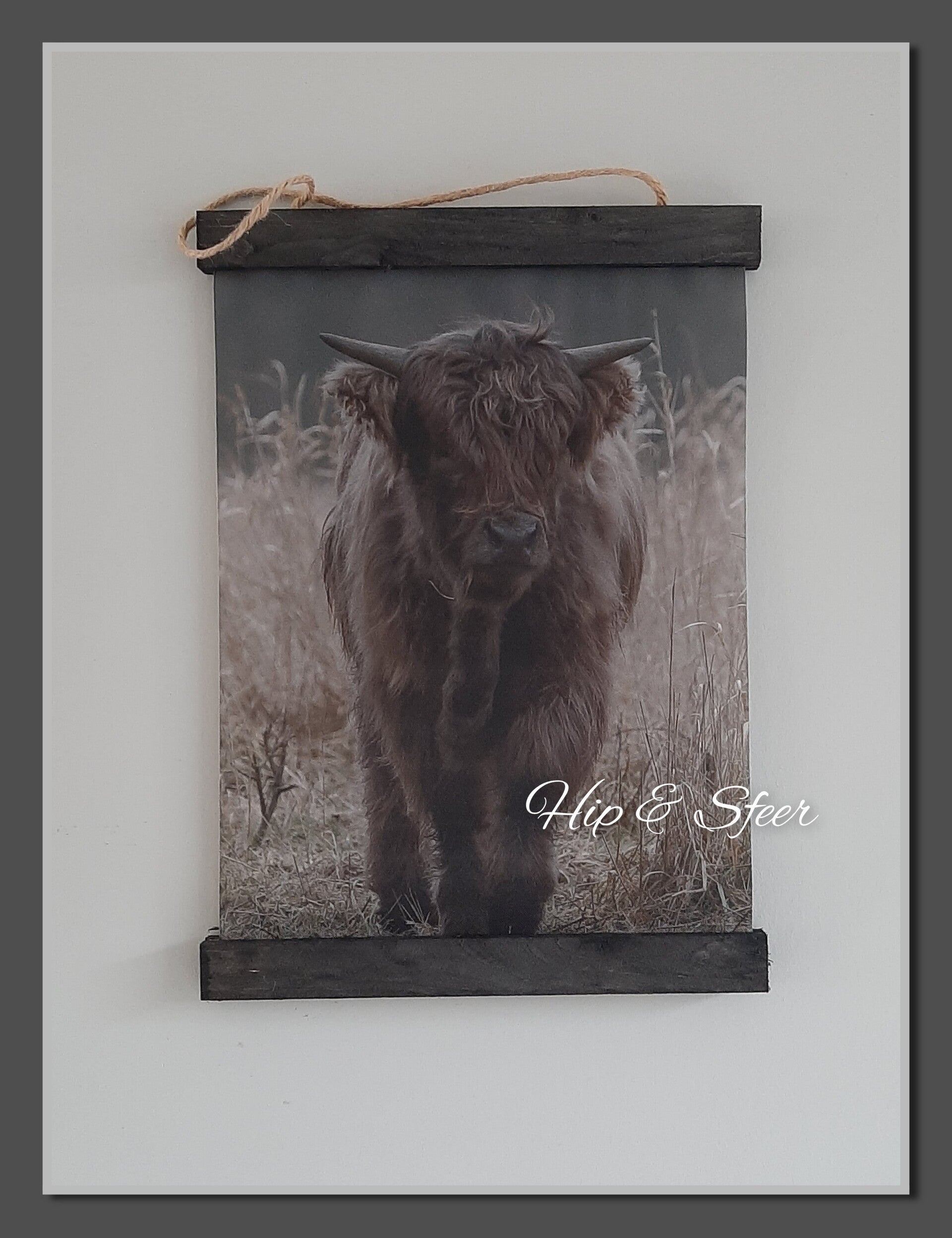 Wanddoek met de afbeelding van een hooglander. Dit wanddoek heeft een afmeting van 40x60cm en is voorzien van zwarte latten aan de onder-en bovenkant en heeft een ophang koord.