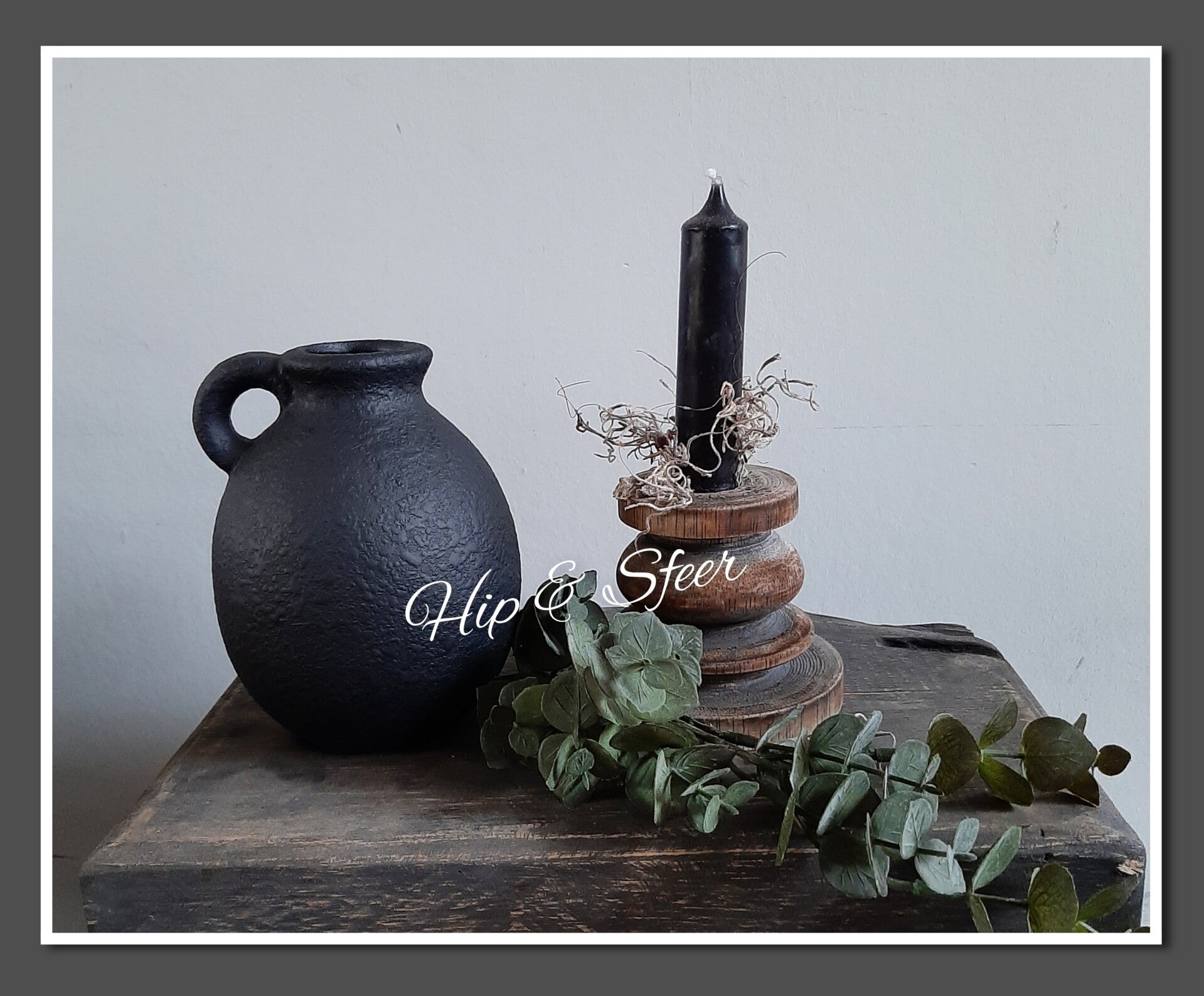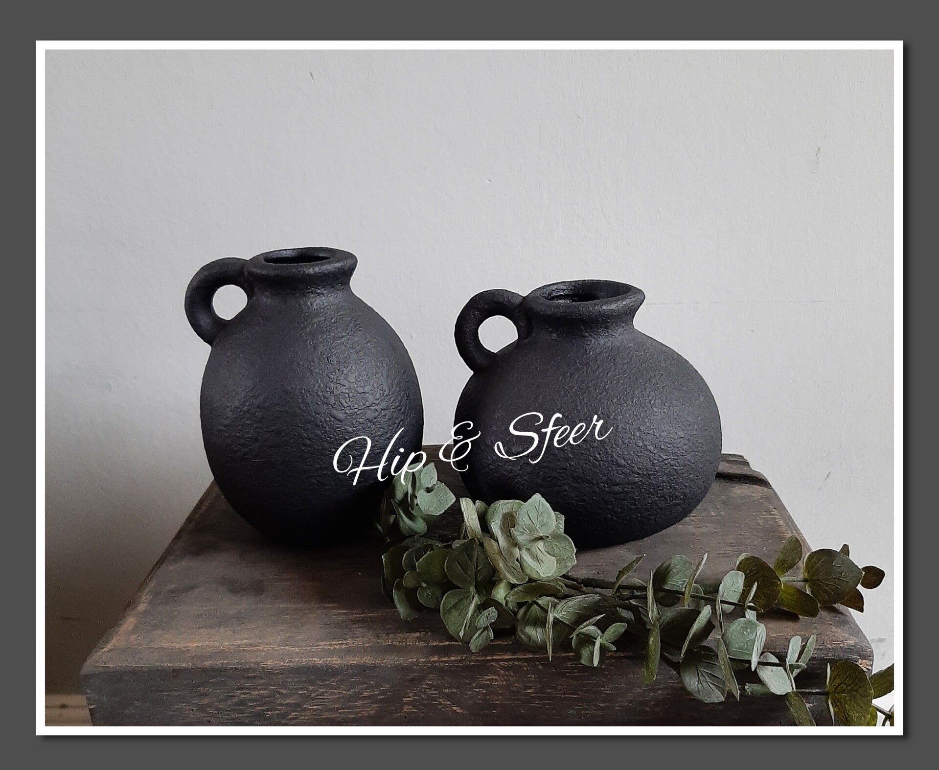 Mooi zwart kruikje met oor in een hoog model. De afmeting van het kruikje is 14cm hoog en de doorsnee is 9cm.